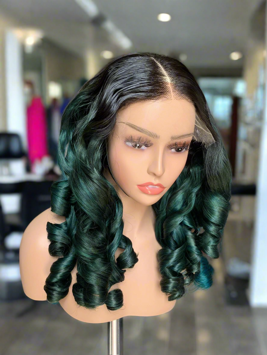 Introducing Jaida, a show-stopping emerald green balayage lace front wig made from hand-colored, 100% single-donor human hair. This luxe unit features a deep black root melt that seamlessly transitions into a rich jewel-toned emerald green, offering a bold yet sophisticated look with natural movement and luster.